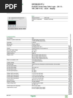 SR3B261FU Modular smart relay Zelio Logic 26 IO 100240 V AC clock display Main Range of product Zelio Logic Product or component type Modular smart relay Complementary Local display With Number or control scheme lines 0500 with FBD programming 0240 with ladder programming Cycle time 690 ms Backup time 10 years at 25 C. ZGeneral presentation of the smart relay. Of IO Discrete Inputs Analog Outputs Clock Price Each 1 5 10 25 Supply Voltage. This document is divided into 5 parts and addresses the following topics. SR2MAN01 112007 11 I Initial Power up and Discovering Presentation. Size 369 MB The documentation is not updated automatically but we make every effort to provide the latest versions of the documents.